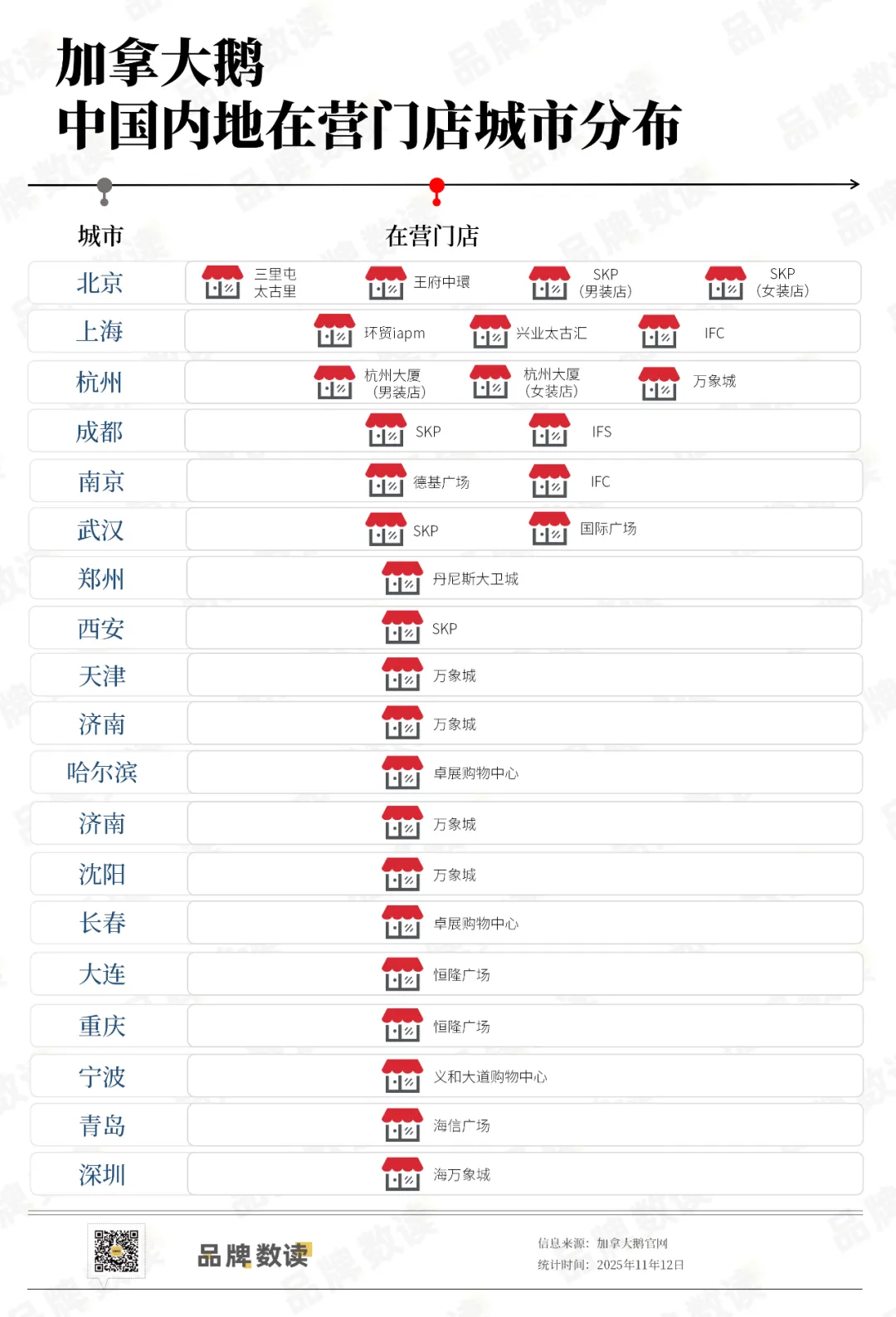 城市布局方面,去年11月,加拿大鹅在中国17城(不包含港澳台地区)设有独立门店,不包含快闪门店为16城,现在,加拿大鹅在营门店所覆盖的城市为19城。
