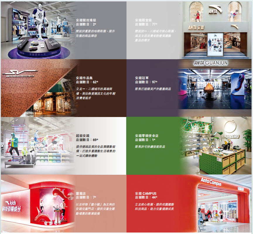 细分看,安踏品牌为切入各类细分市场做了详尽布局,其新业态主要包括安踏竞技场级、安踏殿堂级、安踏作品集、安踏冠军、超级安踏、安踏零碳使命店、安踏校园、灵龙店等。