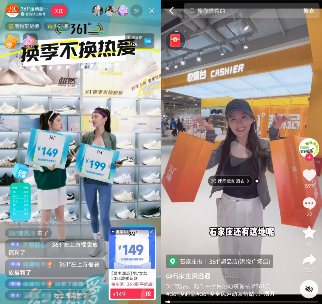 对于361°这样的传统鞋服品牌来说,其不仅在抖音为超品店线下门店找到了新的辐射方式,品牌也借此找到年轻化的方向,触达更多的年轻消费者。