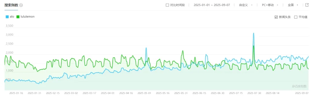 对比Lululemon与alo品牌搜索指数,2025年上半年Lululemon维持平稳势态,alo持续增长,于5月首次超过Lululemon品牌热度,7月正式开启了热度碾压Lululemon的局面。