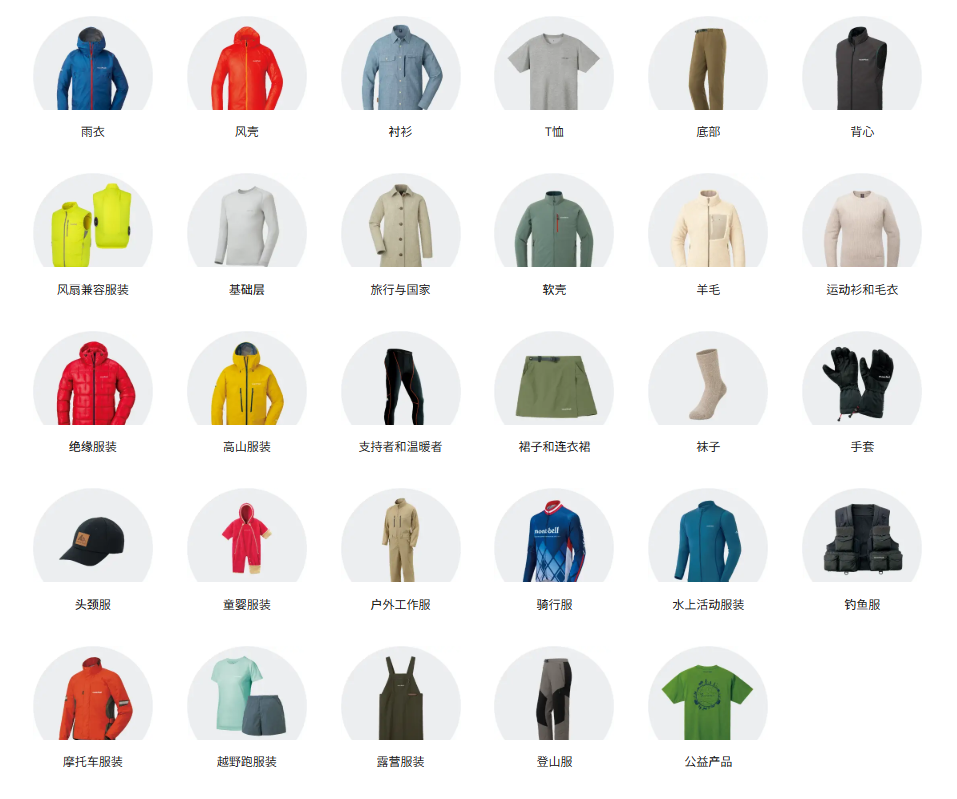 首先,montbell并非专注于某个品类支线,而是提供丰富的产品线,包括羽绒服、冲锋衣、抓绒衫、登山包、抓绒围巾、防晒衣、保温杯等,覆盖了滑雪、登山、徒步、露营、骑行、攀岩、钓鱼等大部分户外运动。