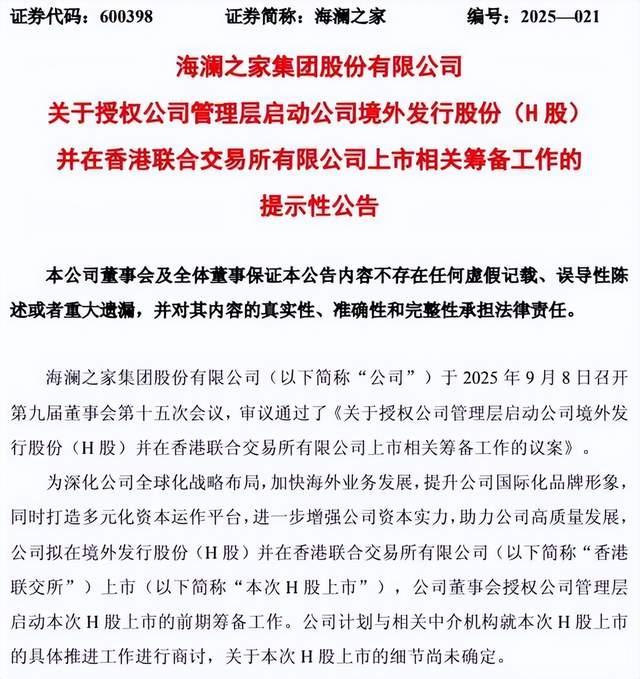 9月8日,海澜之家发布公告称,拟在境外发行股份(H股)并在香港联交所上市,董事会已审议通过议案并授权公司管理层启动相关前期筹备工作,此举旨在深化全球化战略布局,加快海外业务发展。