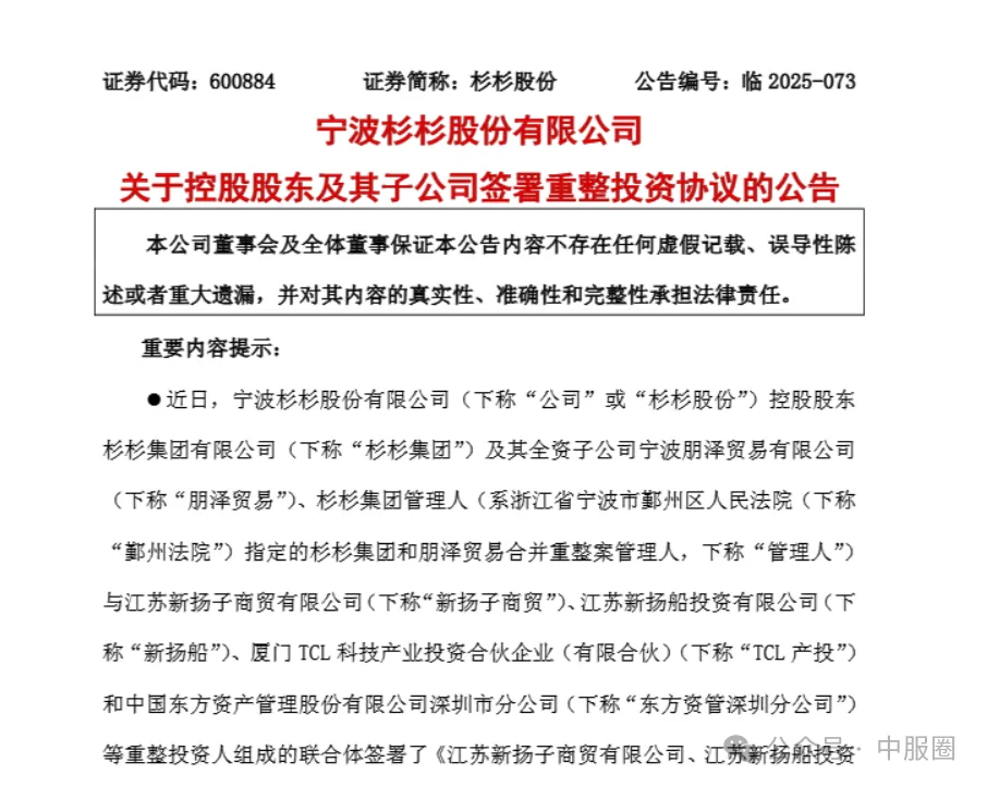 2025年2月25日,宁波市鄞州区法院裁定受理杉杉集团破产重整案。3月20日,法院裁定对杉杉集团和其全资子公司朋泽贸易进行实质合并重整。6月6日,管理人发布意向投资人招募公告。