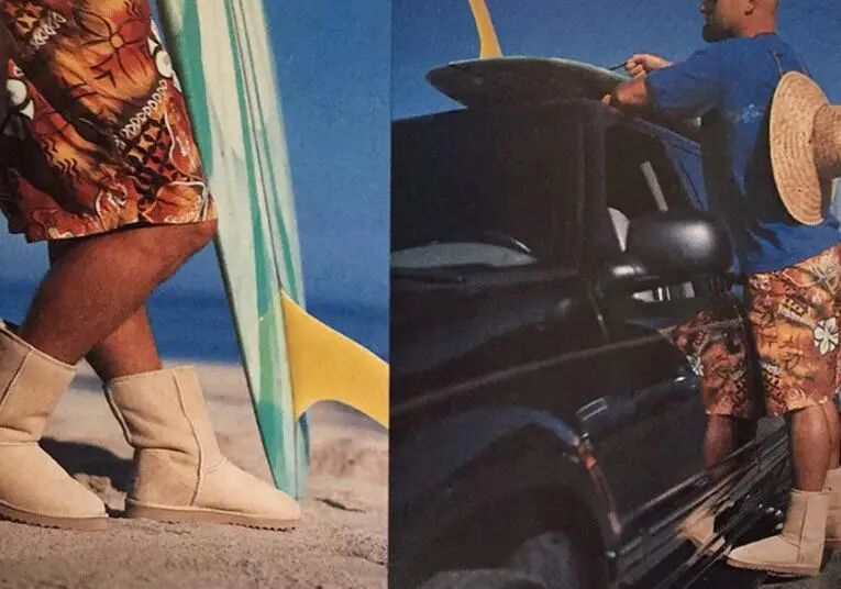 1994年,美国报纸《今日美国》发表了一张演员帕梅拉·安德森 (Pamela Anderson) 在《海滩救护队》片场的照片,她穿着一套红色泳衣和一双UGG靴子,造型靓丽,这张照片被广泛传播。其脚上的那双丑丑的羊毛靴子,也随着影视作品的走红,开始被更多美国消费者熟知。