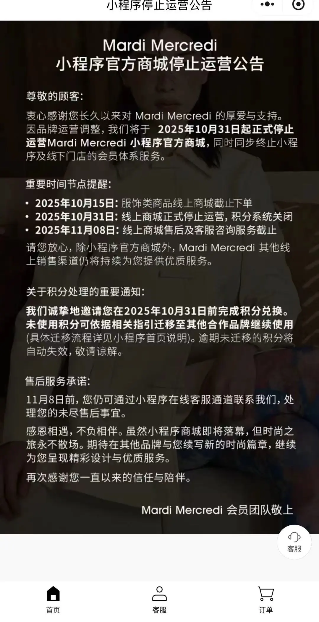 在线上渠道,Mardi Mercredi品牌微信小程序官方商城也发布通知称,商城将于10月31日起停止运营,同时同步中止小程序及线下门店的会员体系服务。会员需在10月31日前完成会员等级及积分向RAIVE、Rest&Recreation两个品牌的迁移,逾期未操作则等级、积分自动失效。其中,服饰类商品线上商城已于10月15日截止下单;10月31日起线上商城正式停止运营,积分系统关闭;11月8日,线上商城售后及客服咨询服务将截止。