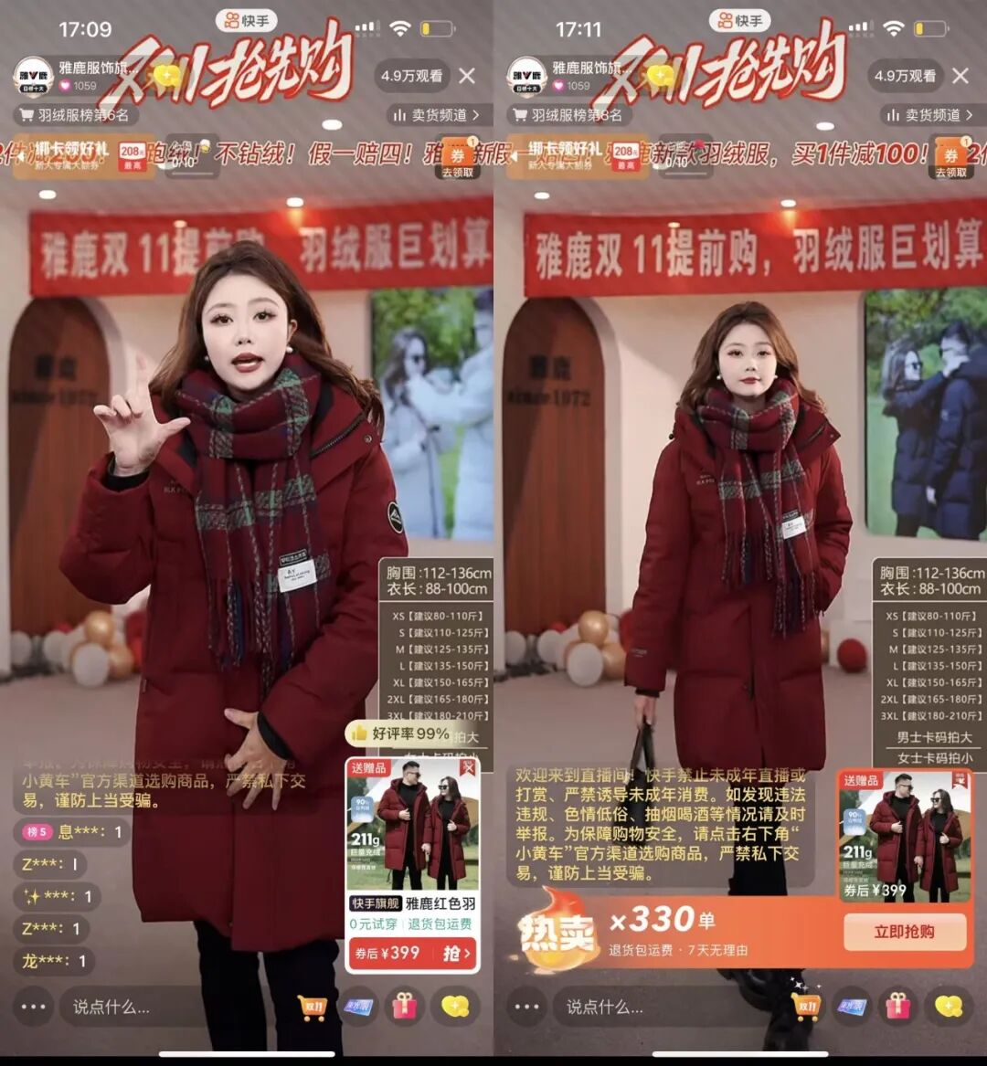 针对降温的商机,雅鹿提前针对羽绒服和保暖裤做了充分备货,并前置了所有的库存、打包及发货。直播节奏上,雅鹿进一步提升开播频次和时长,由原计划一天直播6小时增加至12小时,直播内容上采取“真人试穿+细节拆解+售后承诺”三重举措,配合方言互动、粉丝评论实时回应,提升用户信任。