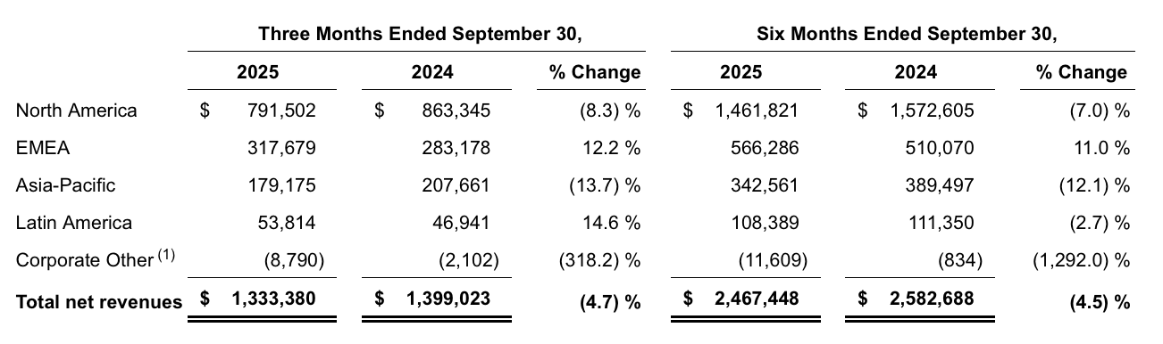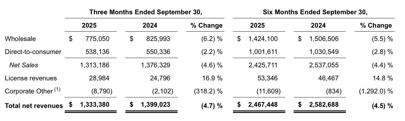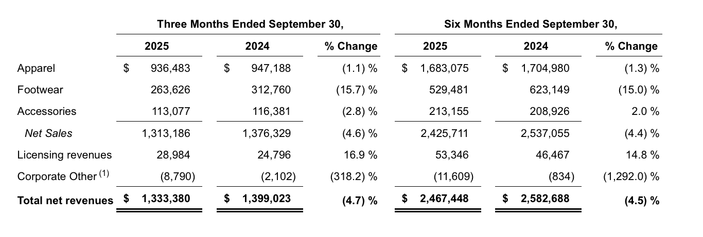 附:Under Armour 安德玛至9月30日的2026财年第二季度财报细节
