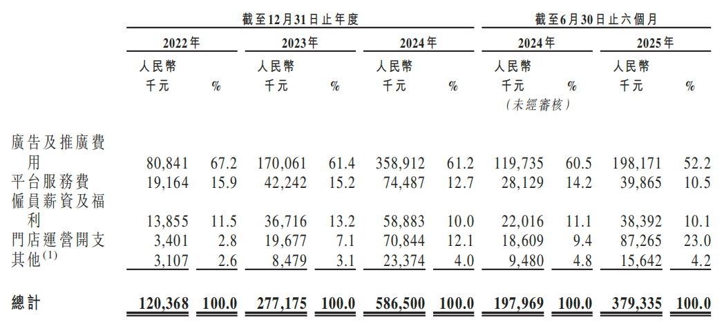 其中,广告及推广费用分别为8084万元、1.7亿元、3.59亿元、1.98亿元,前三年基本都在翻倍增长;各占总营收的21.37%、18.72%、20.32%、21.66%。