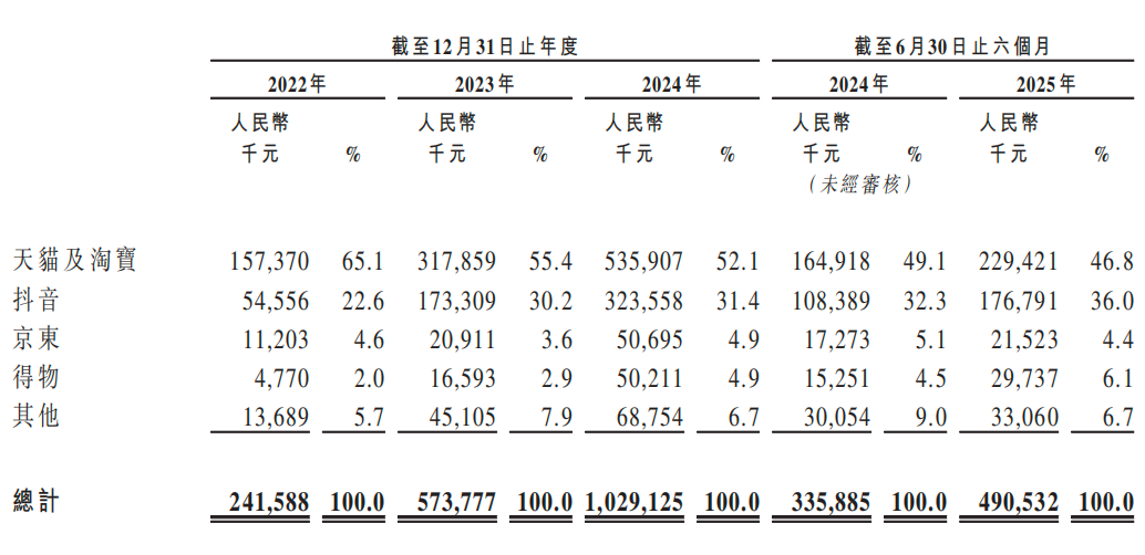 其中,天猫及淘宝自营店铺是伯希和主要线上渠道,收入从2022年的1.57亿元增加至2023年的3.18亿元,并在2024年增至5.36亿元。来自抖音的收入也增长迅速,分别为5456万元、1.73亿元、3.24亿元。2025年上半年与去年同期相比,天猫及淘宝自营增长38.79%至2.29亿元,抖音增长63.89%至1.77亿元。