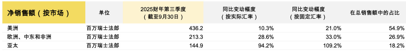 公司表示,在战略重点的持续推进下,公司继续实现强劲且多维度的增长。服装品类再次录得异常亮眼的季度表现,各渠道和各地区的占比均实现显著且均衡的提升。服装净销售额同比增长 86.9%,按固定汇率计算增长100.2%。亚太地区连续第四个季度实现三位数按固定汇率计的大幅同比增长(+109.2%),报告净销售额同比增长 94.2%。与此同时,On 的全球高端品牌据点持续扩张,新开零售店包括(加州硅谷)帕洛阿尔托、苏黎世和东京。