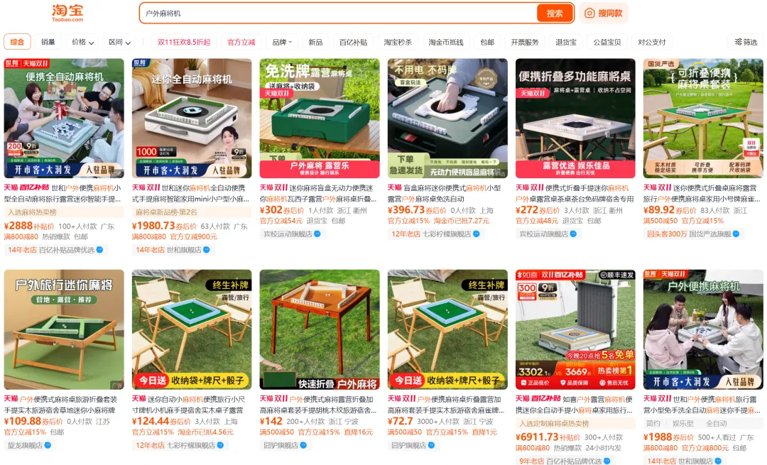 一个更具体的例子是“户外麻将机”。根据天猫双11期间的数据,近30天有超过61万人浏览过该产品,尽管实际购买转化尚处于早期,但其浏览量和购买人数均在自然流量下获得了显著环比增长。这显示出,在核心户外活动之外,用户正在自发探索能提升场景娱乐性和社交属性的新产品。