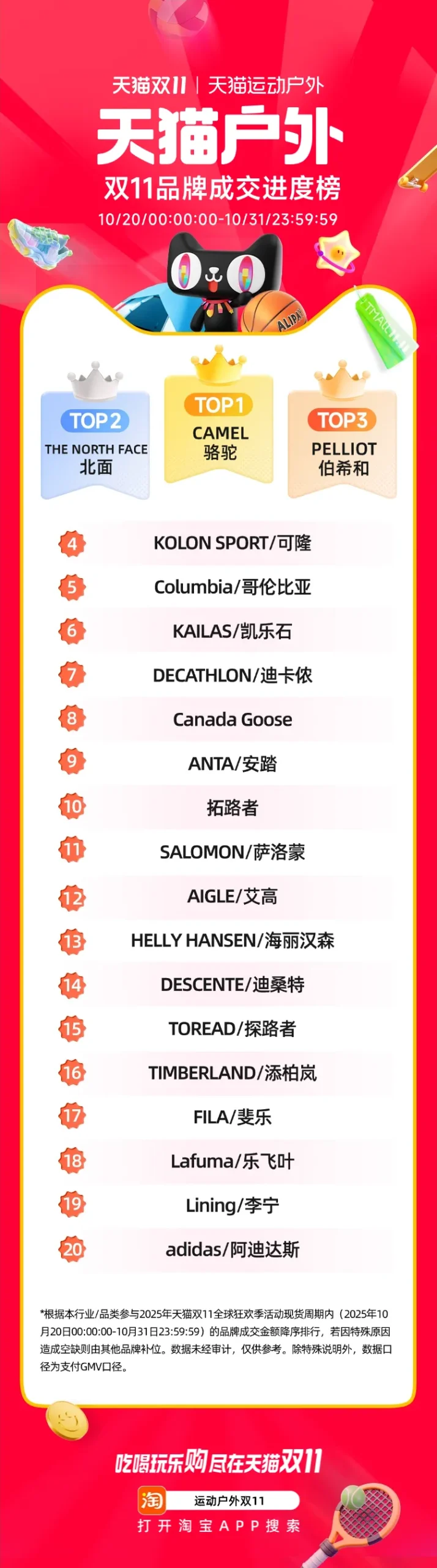 天猫在这方面动作和决心最大。今年年初,运动户外被纳入“天猫扶优”战略体系,与美妆、服饰等核心品类共享内部最高级别的平台资源与扶持。年末双11的战绩也成为观察这一策略成效的重要窗口。