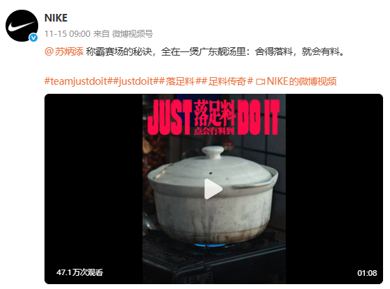 借助在大湾区举办的全运会,耐克联合苏炳添、潘家杰、胡熙宸、邱远青、王文静、潘睿彦等运动员,以“落足料,点会冇料到(下足材料,怎会没实力)”为主题,将煲汤和运动结合做了一番深入广东文化的在地表达,展现品牌运动理念和精神的同时,加强了与本土消费者的情感联结,使其对品牌的认同感与归属感逐渐加深。