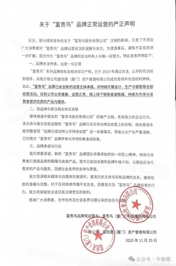 该公司表示,“富贵鸟”系列品牌商标及相关知识产权,已于2019年通过合法、公开的司法拍卖程序,由其母公司盛悦晟(厦门)资产管理有限公司成功竞得并完成权利转移。此后,“富贵鸟”品牌由全新的运营主体承接,并持续开展设计、生产与销售等全部经营活动。“目前公司业务健康、运营正常,线上线下销售渠道畅通,持续为市场与消费者提供优质的产品与服务。”