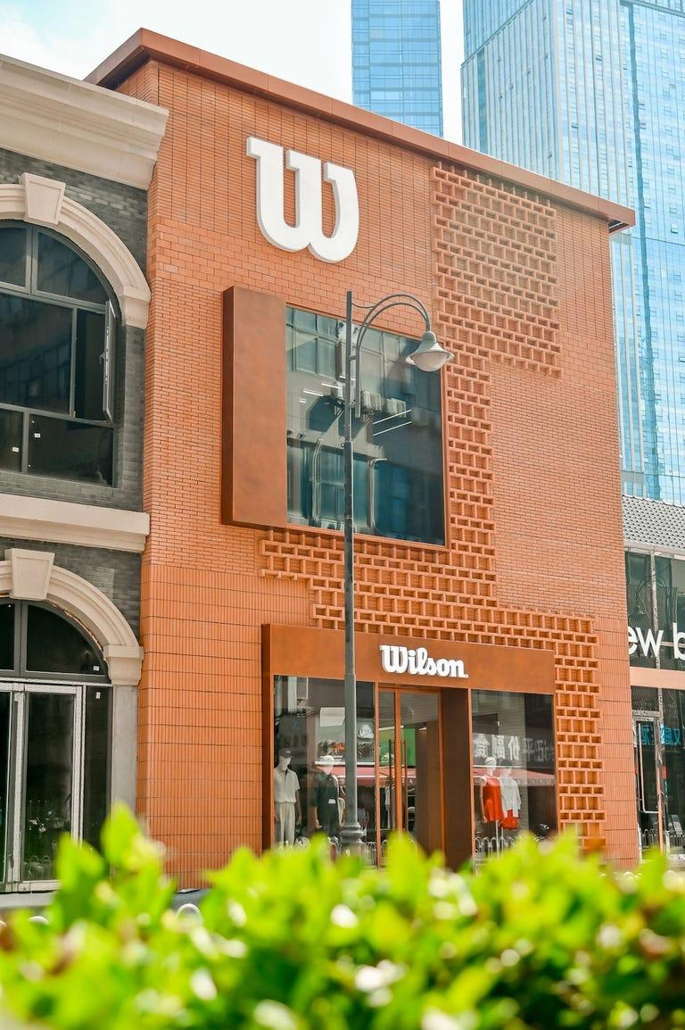 比如,今年 8月, 威尔胜在武汉 SKP 开出的 “Tennis 360” 砖阁概念店,门店外墙使用的红土色清水红砖,按照武汉当地传统民居建筑中使用的不同砌筑方式进行拼接,把美式网球俱乐部风格与武汉本土文化做结合。