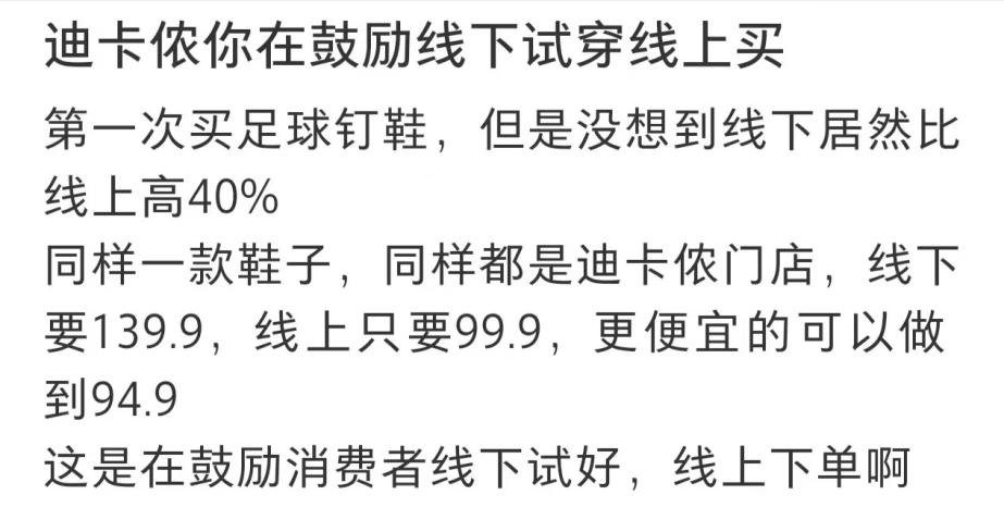 除此之外,有部分消费者在网上发帖称,迪卡侬的运动鞋服等产品,在线上线下不同渠道的产品价格差异较大。线上产品价格往往在低于线下门店一级价差后,促销后还能再低一级,差价幅度较大;不同平台之间也存在波动价差。