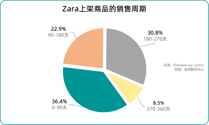 数据显示,在Zara现有的商品组合中,约36.4%的单品在上架90天内即被替换,仍体现出快时尚的典型特征。然而,值得注意的是,仍有63.6%的商品在货架上停留90天以上,其中超过三成的销售周期可达180至270天,更有近一成能持续销售近一年。
