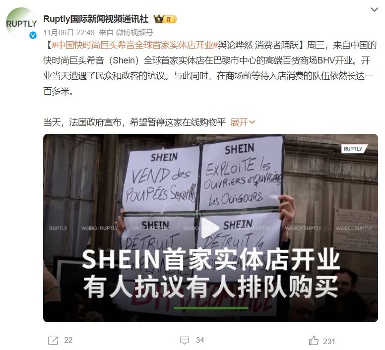 根据今日俄罗斯(RT)下属Ruptly国际视频新闻通讯社报道,SHEIN 11月初在巴黎BHV百货开出全球首家线下店时,迎面而来的不仅排队进店的消费者,还有高举反抗标语的抗议人群。表面上看,抗议的焦点在于环保等老问题,但背后还有错综复杂的行业博弈、利益冲突——这也是摆在中国品牌出海面前的一大挑战。