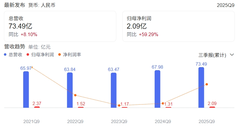 2025年前三季度,孩子王实现营收73.49亿元,同比增长8.1%;归母净利润为2.09亿元,同比增长59.29%。