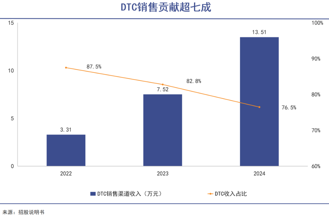 截至2024年末,伯希和的线上DTC销售额已达到13.51亿元,占总收入的76.5%。来自腾讯的生态支持,可能会进一步增强其线上渠道的竞争优势。