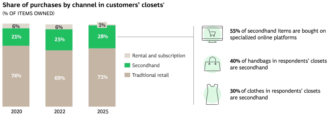 受访者问卷结果显示,他们近28%的衣橱物品为二手购入,较往年显著增长。其中超过一半(55%)的二手购买行为发生在 Vestiaire Collective、The RealReal 或 Vinted 等线上多品牌二手交易平台,凸显了数字渠道在推动二手消费普及方面发挥的核心作用。