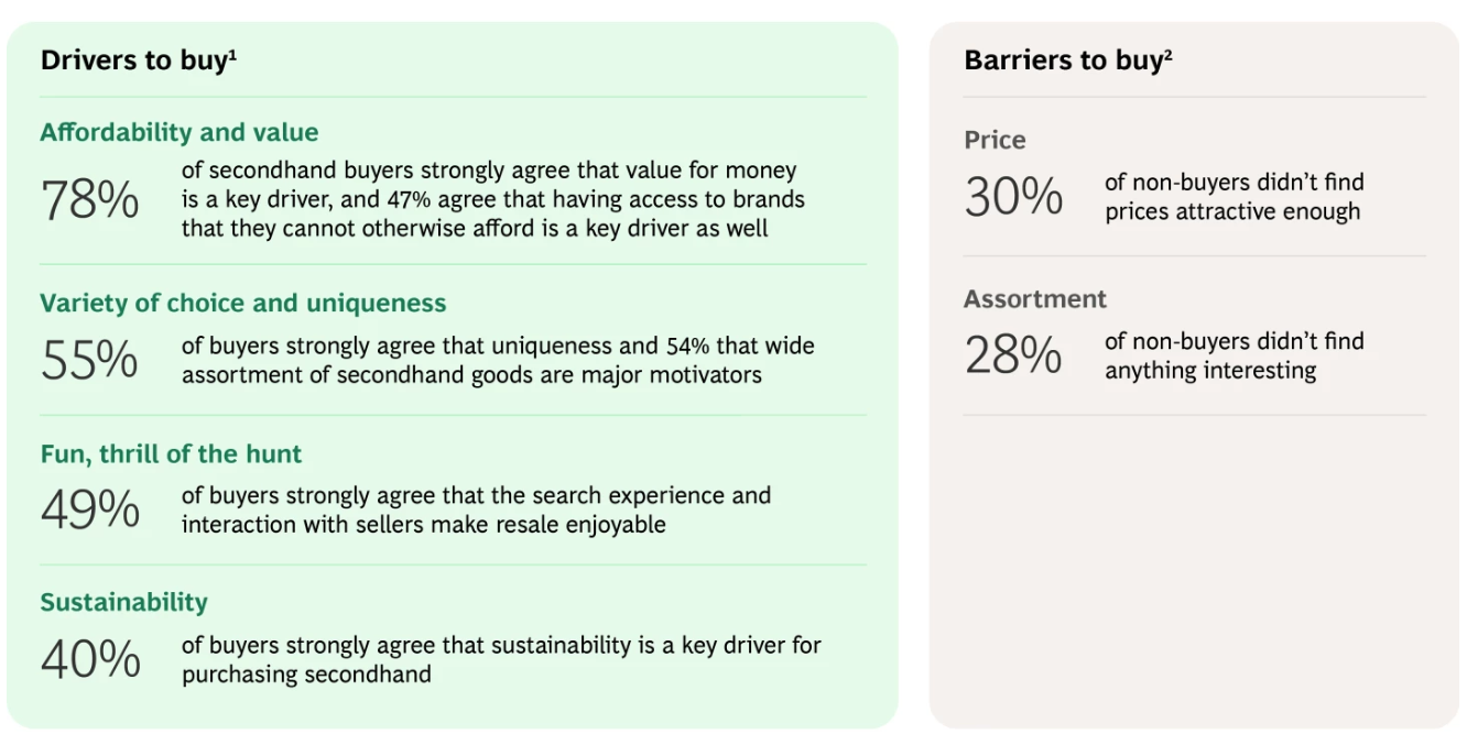 Z世代的独特之处在于他们赋予二手交易的情感和创造力。与大多数消费者一样,Z世代购买二手商品的主要驱动因素是价格(74%),但风格、探索和尝试也是重要的考量因素。