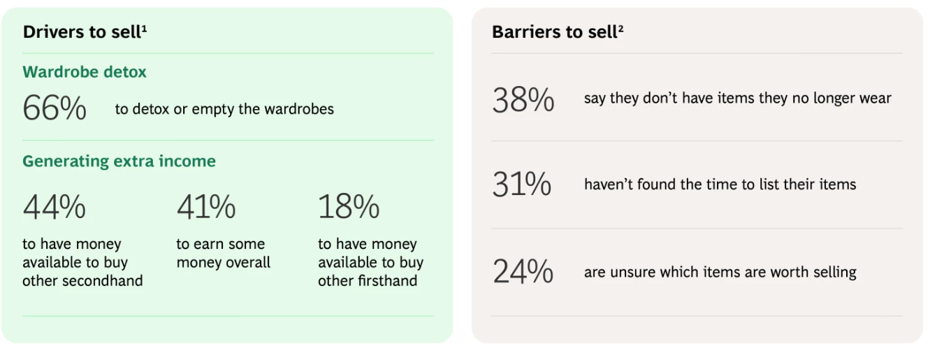 对于卖家而言,66%表示出售衣物是为了清理衣橱,41%的人是为了回收残值并赚取现金,44%的人出售衣物是为了筹集资金购买未来的二手产品,18%的人出售衣物是为了购买新的全新商品。