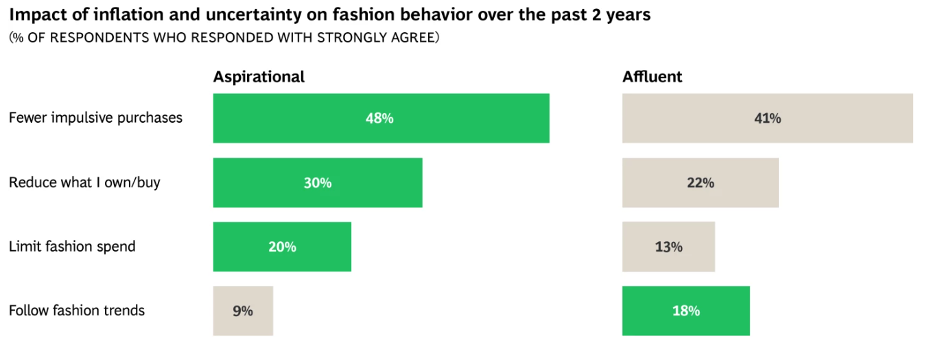 约40%的受访者表示他们的衣橱保持稳定或有所缩减,而富裕消费者中这一比例为30%。他们还报告了更显著的购物习惯转变——冲动消费减少(48% vs 41%),购买或拥有的衣物总量减少(30% vs 22%),以及更倾向于控制时尚支出(20% vs 13%)。