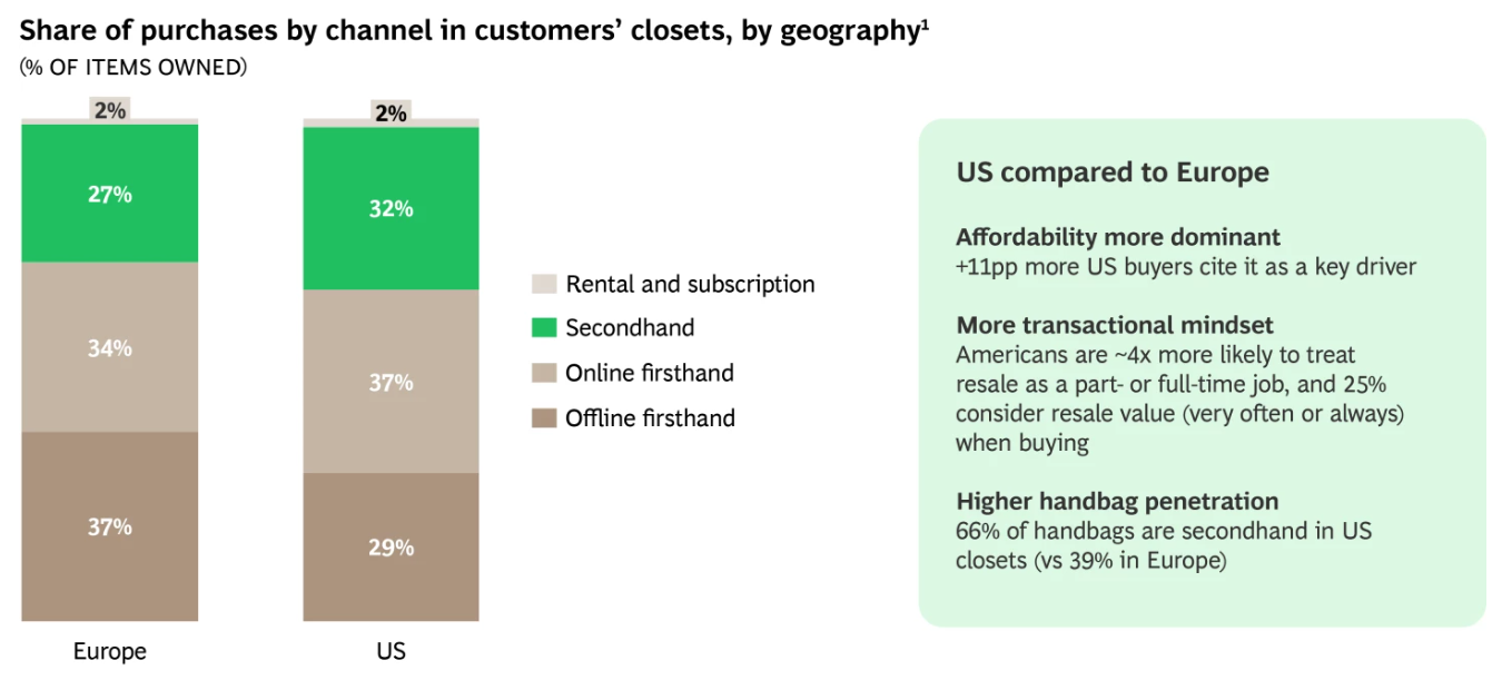 美国受访者在二手商品消费方面走在前列,二手商品占他们衣橱的32%,其中手袋的比例更是高达66%(欧洲为39%)。