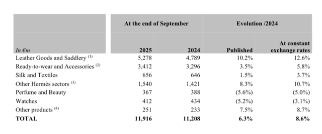 再加上二手市场里爱马仕的“高保值”一定程度上影响了客户去专柜买包的行为,再次加重了其他条线的滞销。而爱马仕2025年对皮具线的依赖程度也加深了不少,前三季度皮具线的销售额占总营收的44.35%。