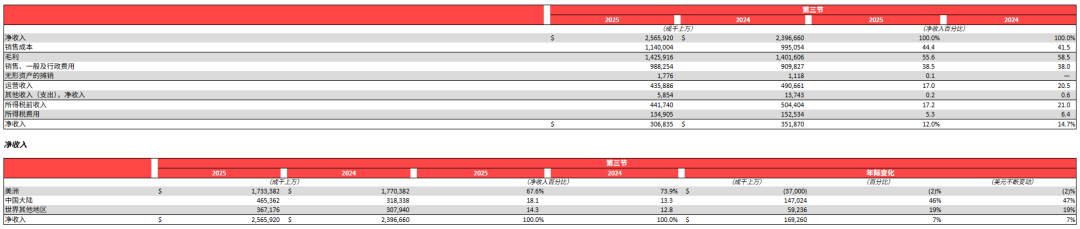根据财报,第三季度,lululemon美洲市场净营收同比下降2%至17亿美元(约合人民币118.78亿元),可比销售额下降5%;中国大陆市场净营收同比大涨46%至4.65亿美元(约合人民币32.49亿元),可比销售额同比增长24%,成为拉动全球增长的绝对核心;其他国际市场净营收同比增长19%至3.672亿美元(约合人民币25.66亿元),可比销售额增长9%。