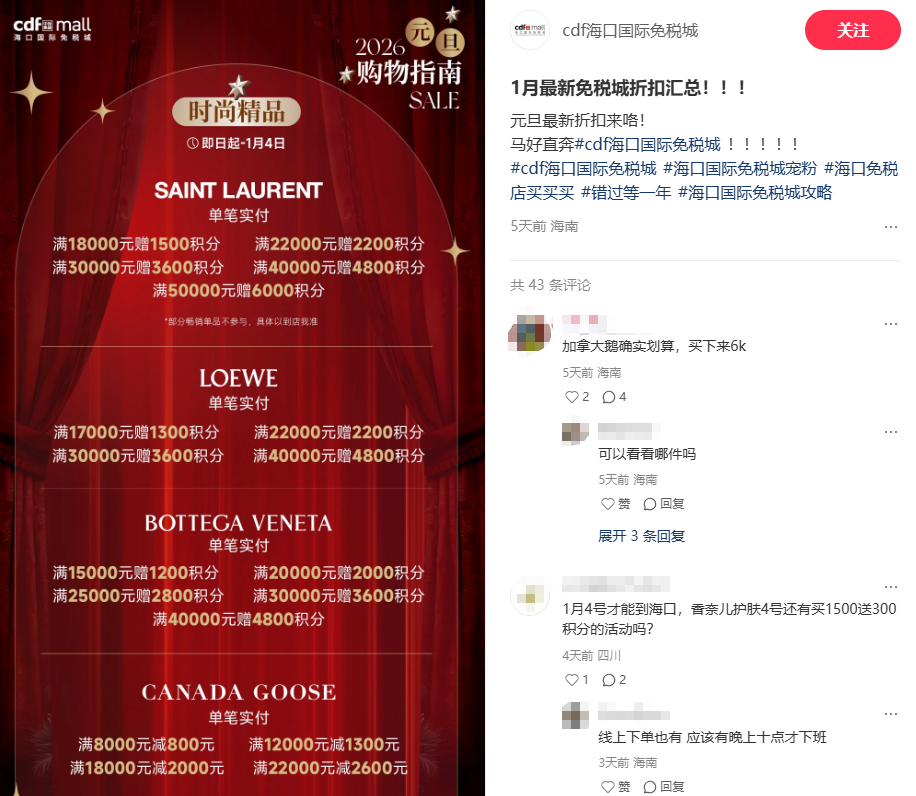 比如近期,cdf海口国际税城推出“时尚精品”促销活动,包括圣劳伦、罗意威、葆蝶家、加拿大鹅在内的多个品牌在免税的基础上推出消费满额赠送积分、满8000元减800元、满1200元减1300元等优惠活动。