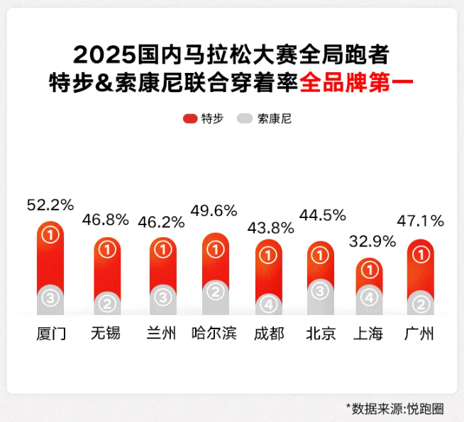 另据悦跑圈数据,2025年,特步在国内八大马拉松赛事全局跑者中,与索康尼的联合穿着率位列全品牌第一。其中,特步品牌占比显著高于索康尼,是主要贡献力量。