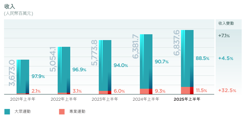 根据2025年中报,其以特步品牌为主的大众运动板块收入增速下降至个位数。另一个以索康尼和迈乐品牌为主的专业运动板块(大部分收入由索康尼贡献),尽管收入增速较快,但其高增主要基于前期低基数水平,且至今仅占集团总收入一成左右,贡献有限。