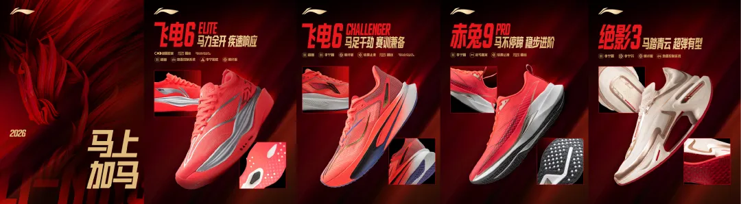 从这个意义上,李宁的“马上加马”限定跑鞋则在城市赛道与路跑场景中延续这一逻辑。作为原本就以中国古代名驹之名来命名跑鞋的李宁来说,通过飞电6elite、飞电6challenge、赤兔9 PRO和绝影3四双跑鞋的马年配色,构建起马年专属产品矩阵,传递疾速奔跑的马年精神,激发跑者群体的认同。