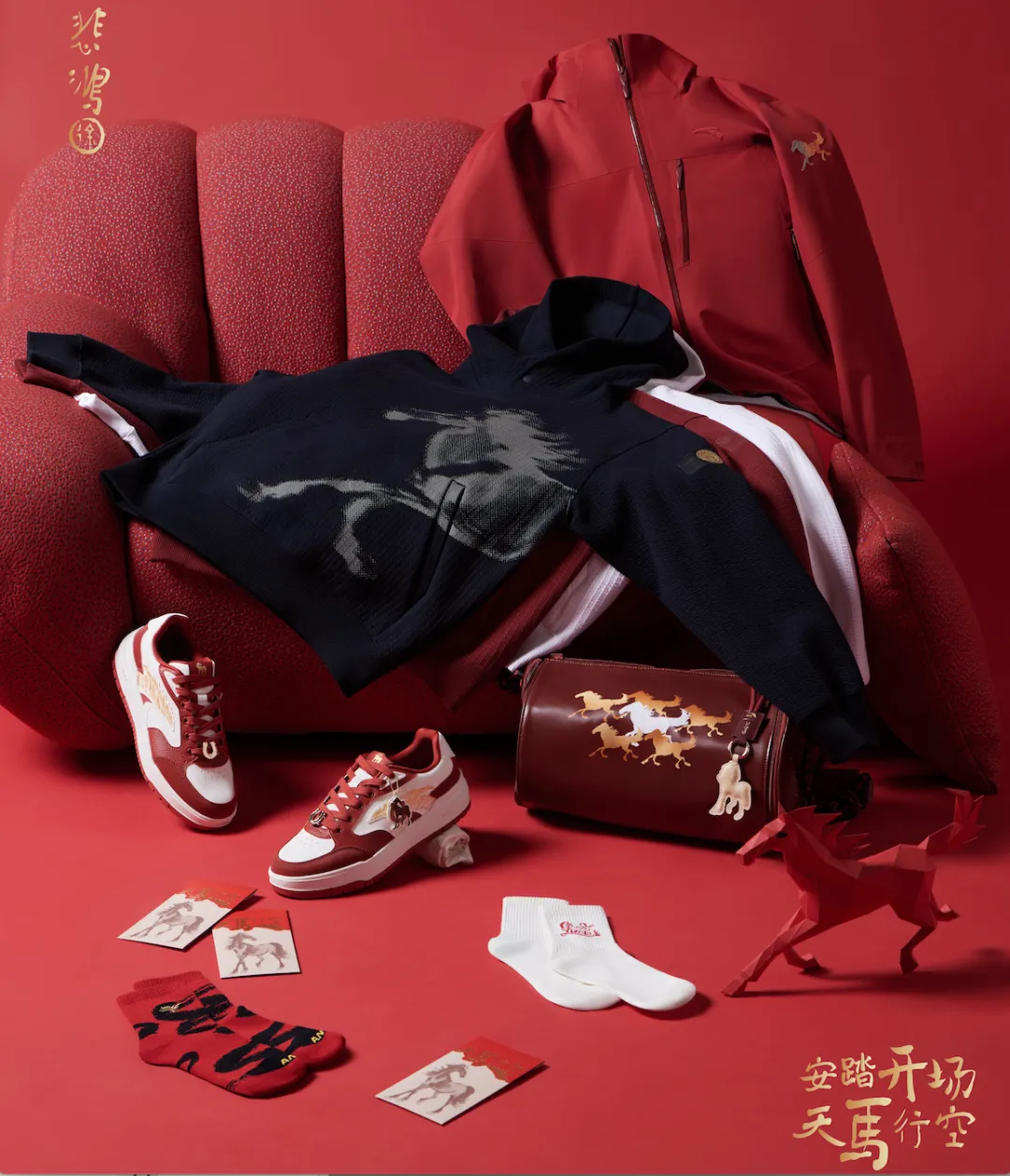 安踏与徐悲鸿艺术联名的 “天马行空”,实则也属于此行列。当然,国内品牌在解构与重构春节文化方面有更明显的本土玩法。安踏将中国传统美术与现代运动装备结合,试图构建一种本土艺术与运动美学的跨界张力。在产品选择上,安踏的“天马行空”系列横跨多个品类和场景,从欧文联名夹克等休闲穿搭、到风暴甲等专业化产品、再到多款专业竞速跑鞋和竞速比赛套装,尽量将新春联名涵盖到不同服装需求。