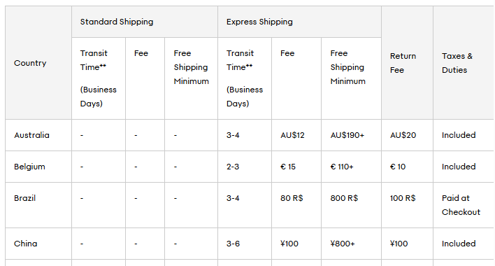 根据官网,中国内地消费者在购买超过800元商品后将可以免运费,退换货费用在100元左右,大概3-6天就可以收货。不同国家或地区的免运费门槛有所不同,例如中国香港需消费满900港元、法国需满110欧元(约合人民币889.15元)、德国需满230欧元(约合人民币1859.14元)……