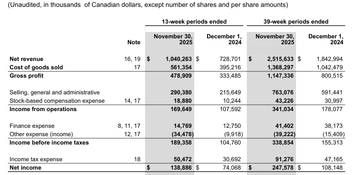近日,加拿大服装零售商Aritzia公布截至2025年11月30日的2026财年第三季度财报。数据显示,Aritzia期内营收同比增长42.8%至10.4亿美元(约合人民币72.48亿元),实现成立以来首次单季营收突破10亿美元(约合人民币69.69亿元)的成就;净收益同比大涨87.5%至1.39亿美元(约合人民币9.69亿元),大幅高于营收增速。