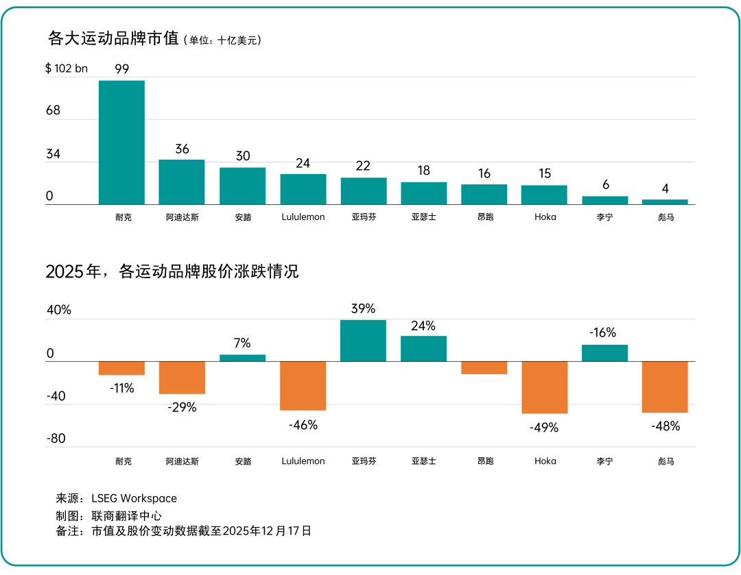 这一分化同样反映在资本市场上。2025年以来,耐克、阿迪达斯股价整体承压,而以中国和亚洲市场为重要增长来源的品牌表现明显跑赢。