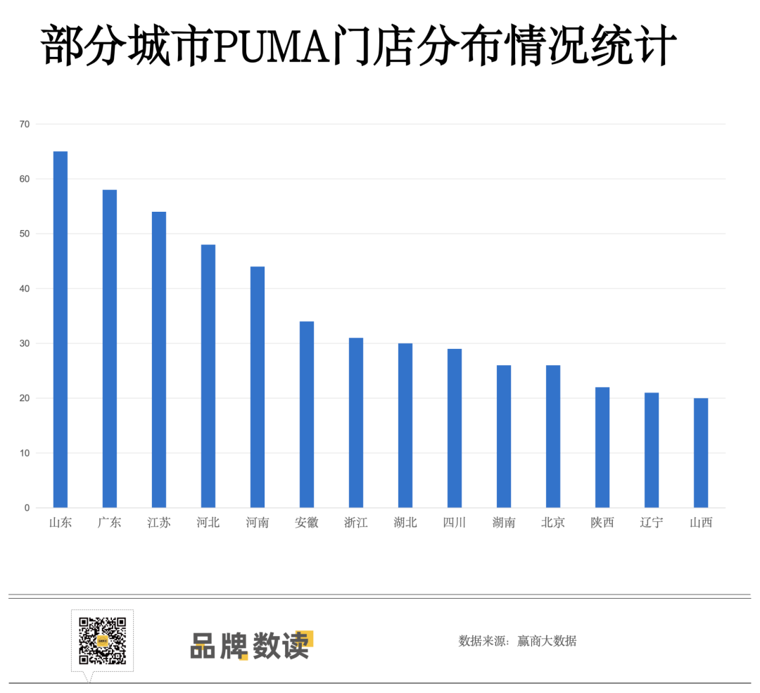 根据赢商大数据统计,目前品牌在中国市场购物中心门店数量约646家(不含PUMA kids和PUMA select),其中店铺分布最多的省份是山东,其次是广东和江苏,门店数量均超50家。品牌也从去年起以中国市场为主阵地进行渠道创新,落地不同类型门店。