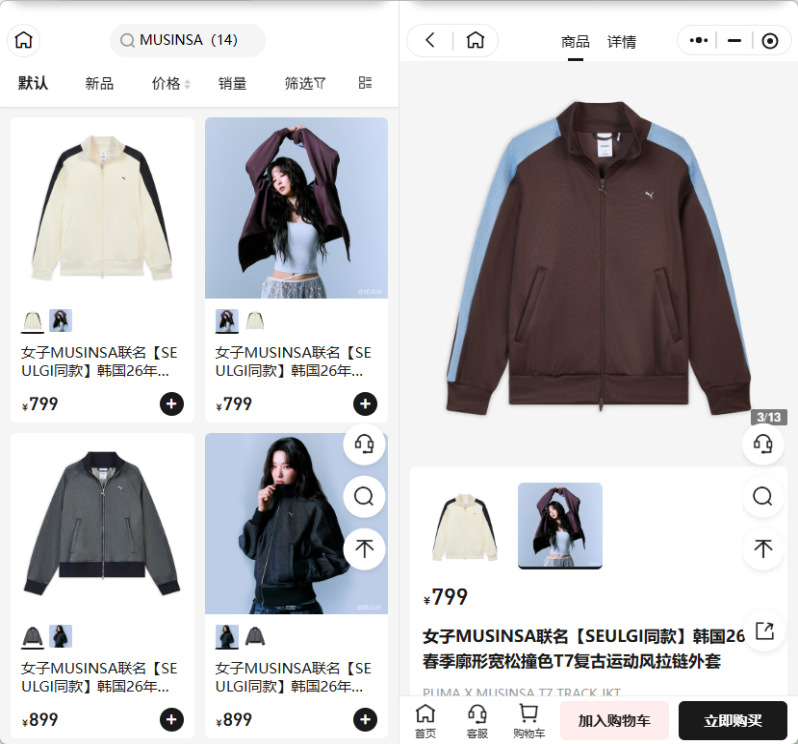 近日,彪马释出与韩国时尚平台MUSINSA的首次联名产品,包括复古运动外套、短裙、长裤等韩式穿搭服饰,价格在450-900元左右;同时品牌空降上海安福路的MUSINSA STORE开设快闪店。