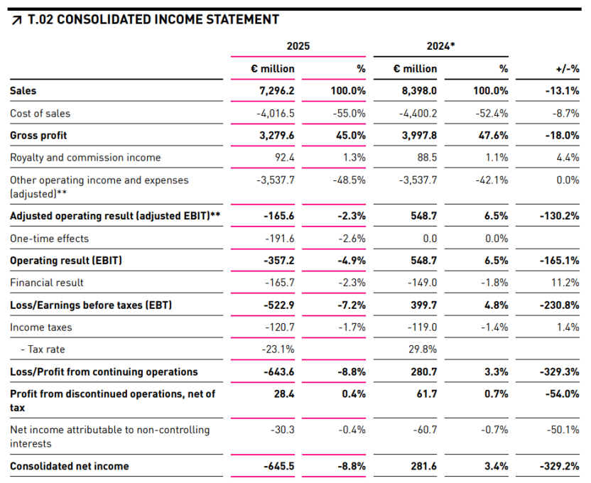 2025年下半年,彪马开启战略重置计划,主要包括:削减批发渠道不良业务、库存回收、减少直销业务(DTC)折扣、裁员等。但从公司2025年全年销售额、整体毛利率的下降,以及多项经营亏损等情况来看,调改仍处于深水区,未见明显起色。