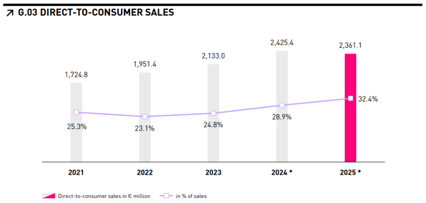 根据财报,2025年,在批发业务销售额下降12.8%至49.35亿欧元(约合人民币390.53亿元)的同时;彪马的电子商务和实体零售店均实现3.4%的增长,推动DTC业务增长3.4%至23.61亿欧元(约合人民币186.84亿元),DTC业务份额增至32.4%。