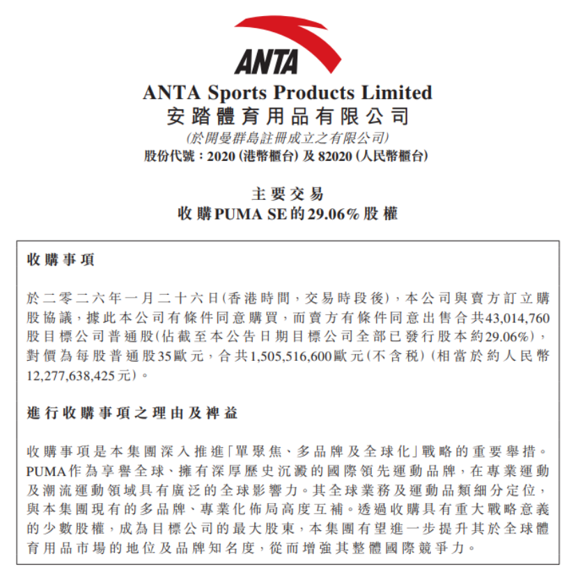 1月27日,安踏集团宣布与法国Pinault家族的投资公司 Groupe Artémis 达成协议,收购彪马所属公司PUMA SE 的29.06%股权,现金对价15亿欧元(约合122.8亿元人民币),交易预计于2026年底前完成。