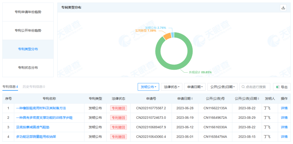 而号称堆砌了各种先进技术及材料、堪比“幼儿版萨洛蒙、On昂跑”的泰兰尼斯运动童鞋,在技术底蕴方面并不一定占有优势。据天眼查信息,其近150条的发明专利里,有130条属于外观设计,只有4条发明公布,且全部属于专利撤回状态。