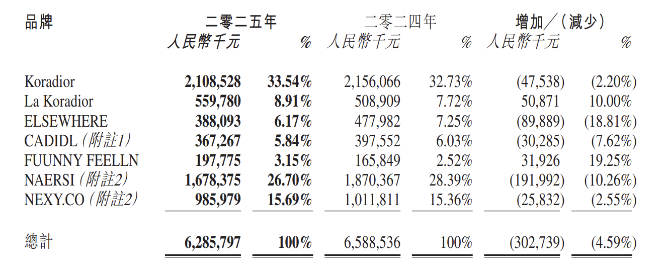 目前,集团拥有并管理七个品牌,包括自有品牌 Koradior、La Koradior、ELSEWHERE 及 FUUNNY FEELLN,以及收购品牌 CADIDL、NAERSI 及 NEXY.CO。