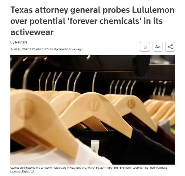 近日,加拿大运动品牌Lululemon因涉嫌含有“永久性化学物质”PFAS遭遇美国得克萨斯州总检察长的调查。