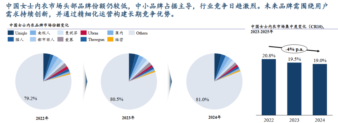 《2026全球女士内衣市场洞察白皮书》数据显示,2022年至2024年,中国女性内衣市场头部品牌CR10仅占约20%。“蕉内真正的竞争对手不是优衣库这类巨头,而是市面上大量的白牌产品。”臧崇羽坦言。