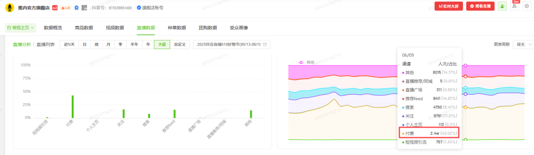 但随着电商平台红利退潮、内衣赛道竞争加剧,流量成本持续攀升,渠道愈发碎片化,属于蕉内的“低成本高增长”时代正在远去。一方面,当前电商平台纯自然流量愈发稀少,蕉内更多依赖付费投流转化。以2025年抖音618期间为例,蕉内官方旗舰店直播,付费投流为流量来源的大头。