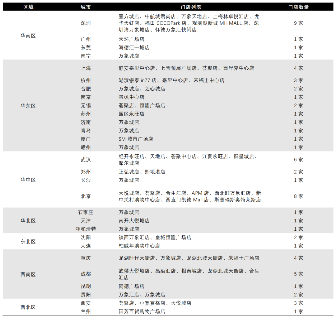 结合蕉内官网门店信息来看,截至4月23日,蕉内在全国门店总共68家。从门店选址与布局来看,其线下门店呈现明显的“重核心、轻下沉”特征。全国68家门店中,深圳、北京、武汉、成都、上海5城占比47.1%,头部市场依赖度偏高。且90%以上门店集中在万象城、大悦城等头部连锁商场,这虽匹配蕉内品牌调性,但也暗藏同质化竞争与租金成本压力。